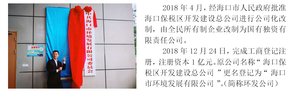 ??谑协h(huán)境發(fā)展有限公司是??谑袑賴歇氋Y有限責任公司,于2018年12月正式掛牌運營,注冊資本1億元,由1993年12月成立的??诒6悈^(qū)開發(fā)建設總公司進行公司化改制而成,核心業(yè)務為環(huán)境環(huán)衛(wèi)產業(yè)投資和運營、資產運營和管理,培育業(yè)務為工程管理